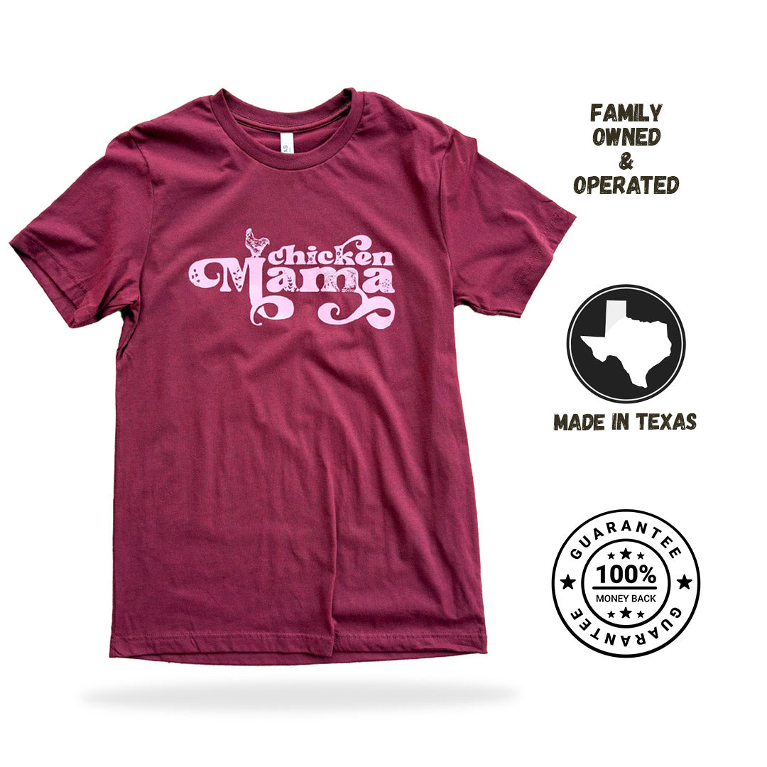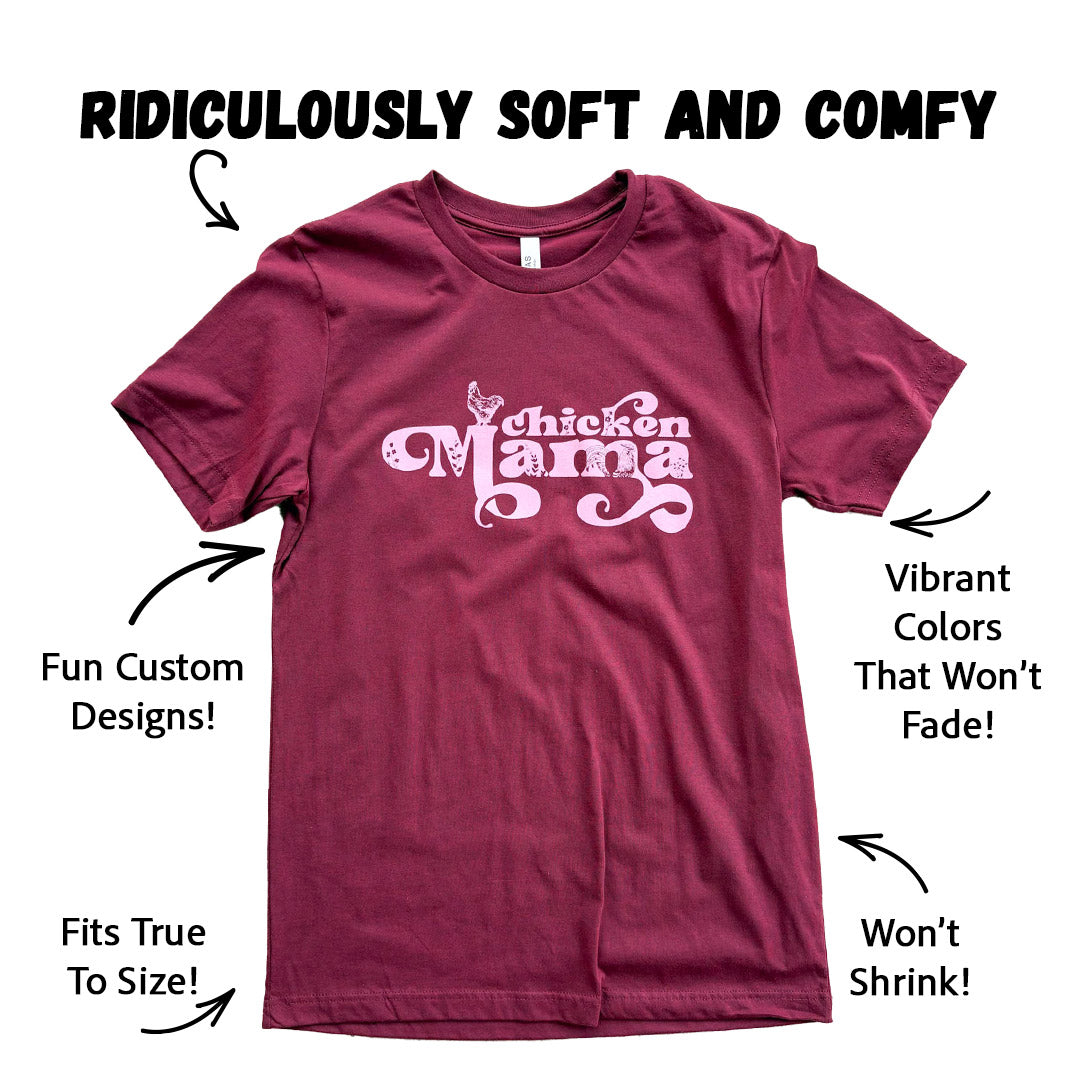 This retro throwback design is perfect for any chicken mom that’s new or seasoned. Enjoy a pink print on a heathered maroon shirt that's a perfect color combo.