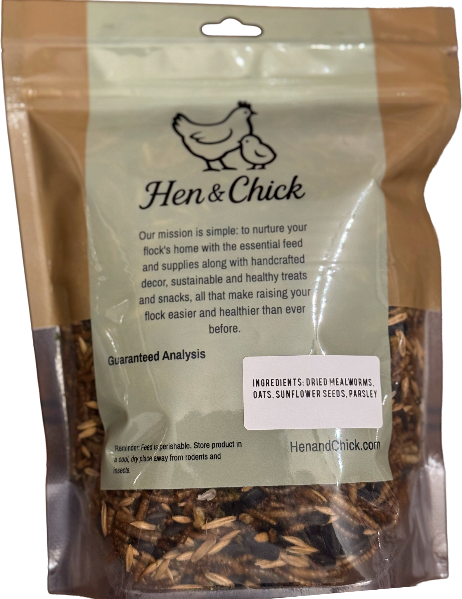 This enduring treat blends dried mealworms for a protein-rich element, oats for a hearty texture, sunflower seeds for added nutrition, and parsley for a fresh, natural touch. Crafted by two sisters and their husbands on their family farm, this blend embodies the brand’s commitment to sustainable, eco-conscious living and a thriving flock environment.